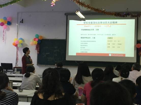 2018年7月13日下午在教五楼506会计手工实验室召开全院大会,党委书记曹玉玲带领全院教职工学习黄色短剧 全面深化改革动员大会精神。 曹玉玲从教师岗位五种分类、职称改革重要六条、会议关键词等教师最关心的三个方面进行了...