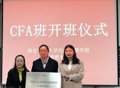 院长苏兵,副院长向海燕,国际经济与贸易专业陈健教授,高顿教育西安分校的校长侯佩及其相关老师,以及CFA班的学员参加了此次活动。苏兵院长和侯佩校长分别发表了热情洋溢的讲话,鼓励CFA学员未来能够取得好的成绩。
