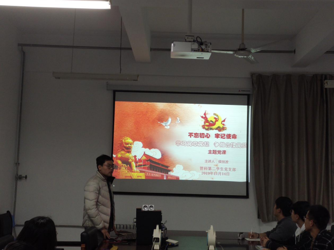 管科第二学生党支部组织开展“不忘初心、牢记使命”主题教育党课活动。本次党课由支部书记侯剑波老师主讲,15名支部党员到场参加。