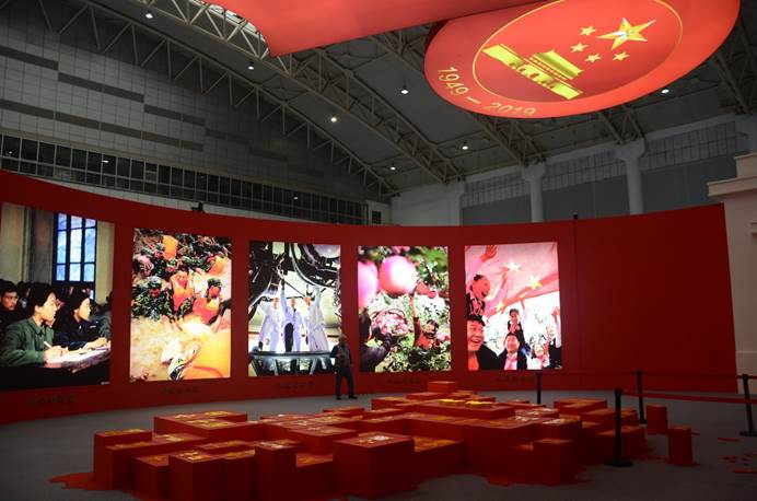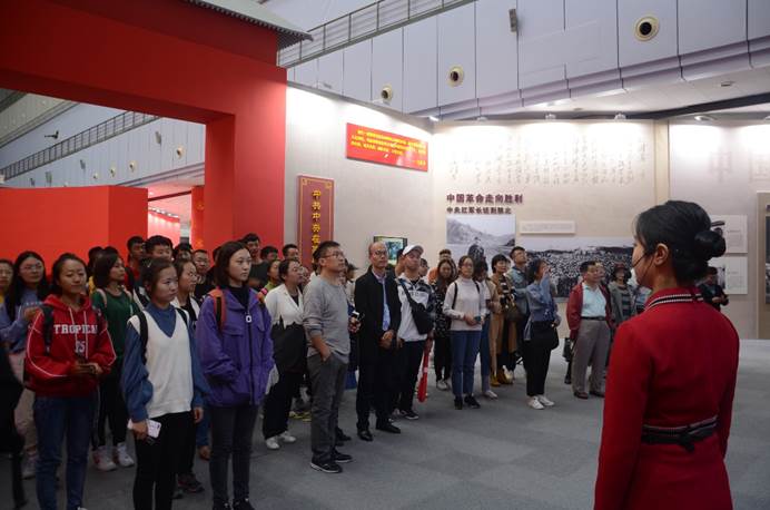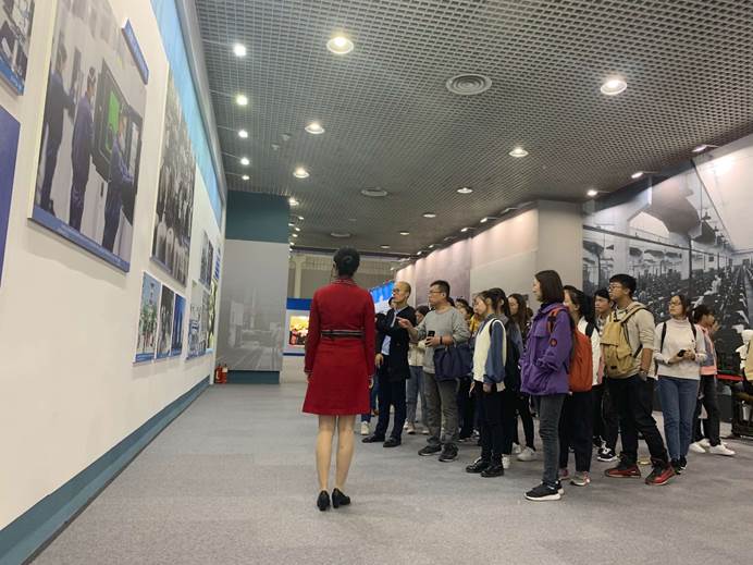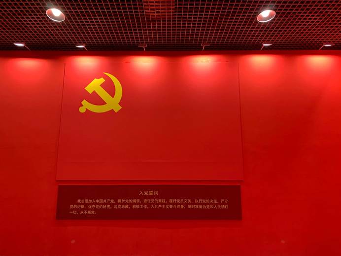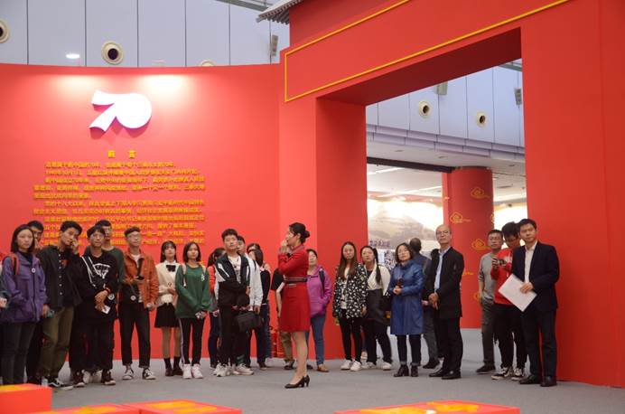 进入展厅首先映入眼帘的是主展厅—新中国成立七十周年以来的变化群像。在主客厅右侧的是正播放周恩来电影的延安电影院的复制馆,随着展馆解说员的带领,师生来到“中共中央在延安”主题馆,回顾中国革命走向胜利的路程。在“三秦日月新”展馆,师生们了解到陕西省奋斗70年日新月异的变化,以及陕西13个城区的发展故事和陕西人民70年生活的变化。在“经济建设”主题馆,师生更加详细地了解陕西省经济的腾飞和战略任务。“三线建设”主题馆中,展馆解说员介绍了三线建设的骨干成员和成就,公路、高铁、航空从无到有再到精的发展举世瞩目。随着解说员的讲解师生进一步的了解到陕西农业、科技以及文化的成果成就。紧接着,展馆解说员又介绍了作为古丝绸之路起点的陕西的“一带一路”成就和发展战略。“生态环境建设”主题馆介绍了更绿更美的三秦大地、和秦岭四宝。进入最后一个展厅,老师们重温了入党誓词,并在党旗下合影留念。至此参展活动圆满结束。