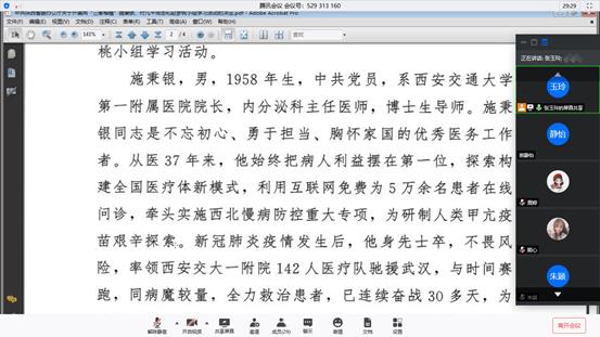 会议伊始,支部书记张玉玲老师带领大家学习“三秦楷模”先进事迹文件。“三秦楷模”施秉银、付凡平同志和赵梦桃小组坚守初心使命、永远奋斗的优秀品格、始终保持为党和人民事业奉献一切的精神、舍身忘我矢志奉献的崇高境界深深鼓舞了大家。