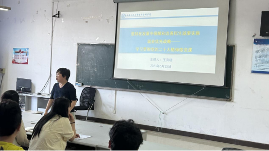 党委副书记王育晓为学院学生党员讲授题为“坚持在发展中保障和改善民生就要实施就业优先战略——学习贯彻党的二十大精神”的专题党课。学院70余名学生党员参加。