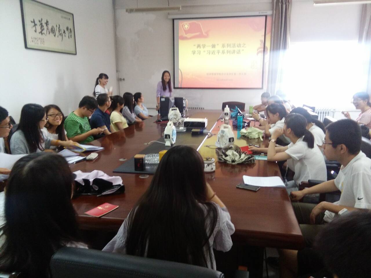 本次活动我们采取的是主题讨论小组的方式进行学习。会议伊始,主持人将支部成员随机分成6个小组,每组成员将自己提前准备好的“习近平总书记系列讲话“的相关学习材料与其他成员一同分享,在同学们讨论的同时,老师会随机取某个组旁听讨论过程,经过30分钟的自主讨论,最终各个小组派出代表将本组的讨论结果与大家分享各组的讨论结果。其中第二组的成员为大家讲解了“五个必须”,既必须坚持走自己的路,必须顺应世界大势,必须代表最广大人民根本利益,必须加强党的建设,必须坚定中国特色社会主义自信;学习什么?为什么学习?以及中国梦的实现条件,如何更好地将中国梦与个人梦想结合起来提出自己的看法。最后,支部书记邵欣老师对本次活动作了总结,指出了大家的不足,并希望小组成员之间互帮互助共同进步增强小组凝聚力。