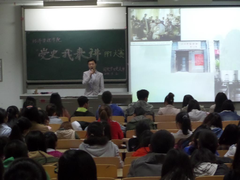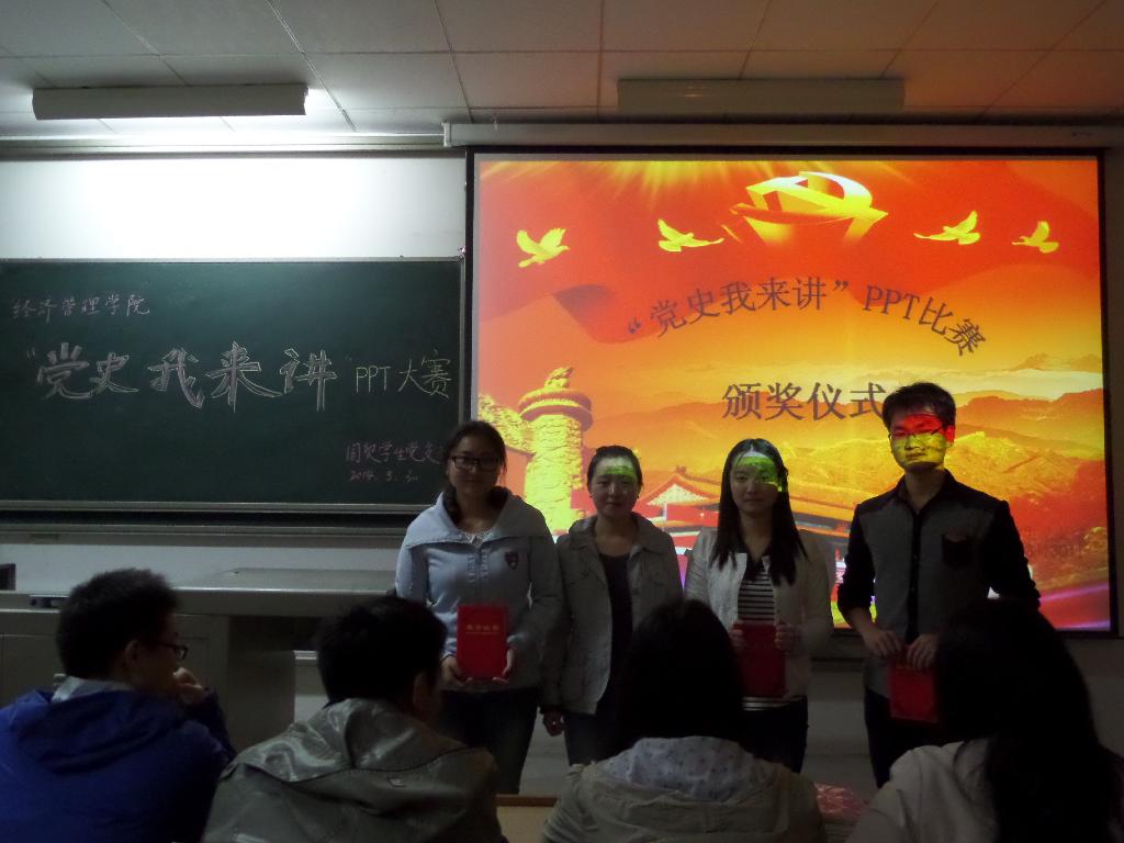 当晚,在紧张的等待中比赛开始了!主持人宣布了比赛的规则和比赛的顺序,接着各年级十五个比赛小组开始按次序上台演示讲解自己的PPT。各比赛小组精心准备了一个多月的作品一一呈现在了大家的面前,PPT内容丰富多彩,从中国共产党的建立到今年两会的召开,形式多种多样,包括传统的PPT和新型的电子杂志,讲解风格各异,有饱含深情的,也有慷慨激昂的。第13组的参赛成员更是与评委和同学展开了互动,将比赛推向了高潮,大家鼓掌称赞。台上参赛小组表现精彩,台下评委评分紧张。最终,在参加比赛的十五组选手中,第8组、第4组、第15组分别获得了一等奖、二等奖、三等奖,第11、13、14 组获得了优秀奖。