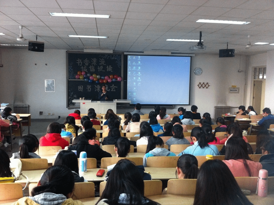 随后,由12级和13级的六位同学通过各具特色的ppt向大家展示自己喜爱的书籍,从三毛的《撒哈拉沙漠》到《守望的距离》到最后简。奥斯汀的《傲慢与偏见》。同学们精彩的讲解使大家沉迷于书籍的魅力,也触动了内心对知识的渴望。之后的自由推荐时间中,又有三位同学即兴向大家推荐了多本书籍,并提供借书机会,场内气氛活跃。