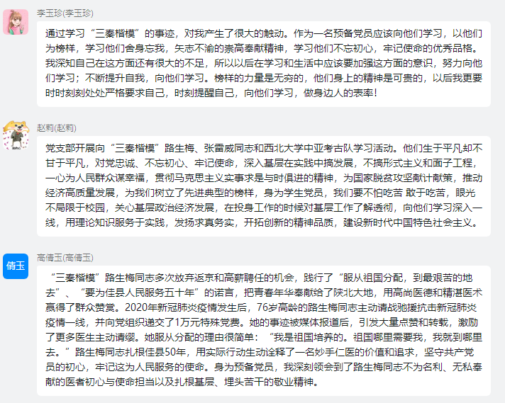 为充分发挥先进典型的示范引领作用,培育和践行社会主义核心价值观,奋力谱写陕西新时代追赶超越新篇章,凝聚强大力量,工商第二学生党支部于3月10日在教5-502开展了向“三秦楷模”路生梅、张雷威同志和西北大学中亚考古队学习活动。支部全体同志参加了此次活动。