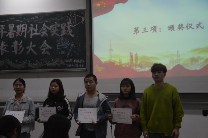 大会伊始,青协部长李素馨对本次社会实践进行总结报告,加深了同学们对社会实践活动的认识与理解。随后,由团委副书记马思聪学姐宣读表彰决定,本次大会重点表彰了院级社会实践优秀团队及个人。并由许金鑫老师和主席团为优秀团体和个人进行了颁奖,对他们的实践精神予以肯定。之后,社会实践优秀团队队长吴依阳、社会实践先进个人代表张晨卓进行了发言。接着大会进行了社会实践优秀DV展示,优秀的摄影作品带同学们领略了社会实践的精神风貌,为大家树立了榜样。大会最后,由许金鑫老师做了社会实践活动的总结,对获奖的个人和团队予以肯定,希望经济管理学院社会实践活动愈加丰富,希望更多的同学积极、认真地参与到暑期社会实践中,书写自己的实践故事。