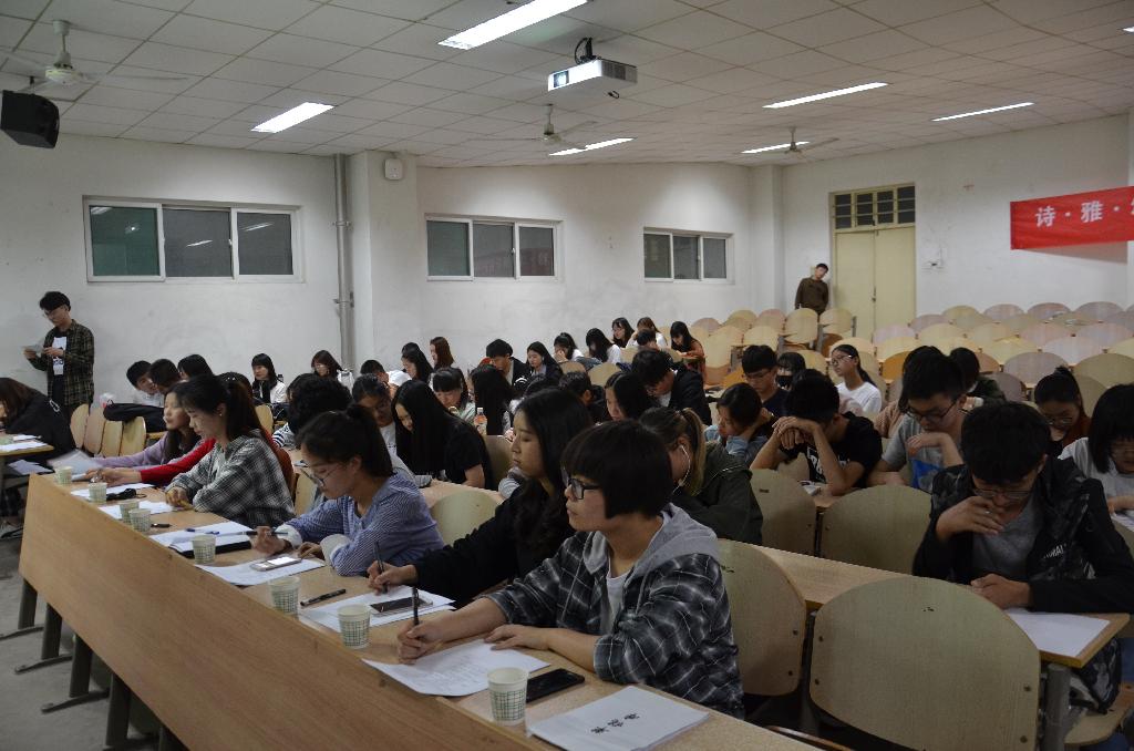 学生会学习部主办的“诗雅颂”倾听青声校园朗诵比赛的复赛于教2-202、203同时举行,出席本次活动的评委有学生会主席刘晨辉,副主席陈华峰以及团学组织的若干部长。
