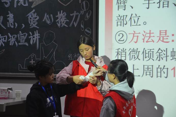讲座伊始,由青协部长李素馨对来自西安医学院的同学进行了简单介绍,并表示热烈的欢迎。其次,由高乔乔同学向同学们介绍了八种常见病及其处理方法。讲解结束后,由服务队干事郭倩向同学们讲解包扎的相关知识,并展示创伤止血与现场包扎技术、现场骨折固定的模拟操作,同学们认真的看着包扎的演示,收益颇丰。最后,付榆涵等同学为大家介绍了心肺复苏的相关知识并模拟心肺复苏的操作,大家热情高涨,对急救知识表现出了极大的兴趣。