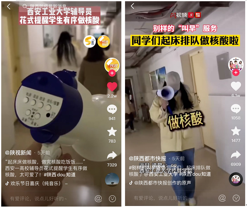 辅导员为引导学生积极排队做核酸而创作的,给平淡枯燥的封校生活增添些许活力。喊楼过程被拍成视频后受到陕西省教育厅、陕视新闻、西安都市快报、陕西政协20余家新闻媒体报道,在微信、抖音、微博、视频号等平台被广泛转载,视频累积转发播放量突破1000万次。