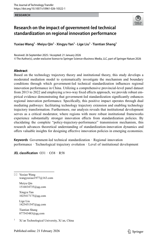 王育晓教授及其硕士生秦美玉等在期刊《Journal of Technology Transfer》发表题为“Research on the Impact of Government-Led Technical Standardization on Regional Innovation Performance”的论文。《Journal of Technology Transfer》为ABS级三星级期刊,JCR管理学1区,最新影响因子为4.30。