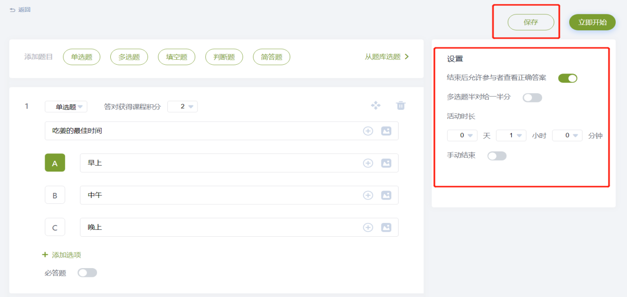 老师进入到自己的在线课程里,点击活动模块,将课堂上设计的活动提前添加保存,活动时长及其他发放细节可由老师自行设置。