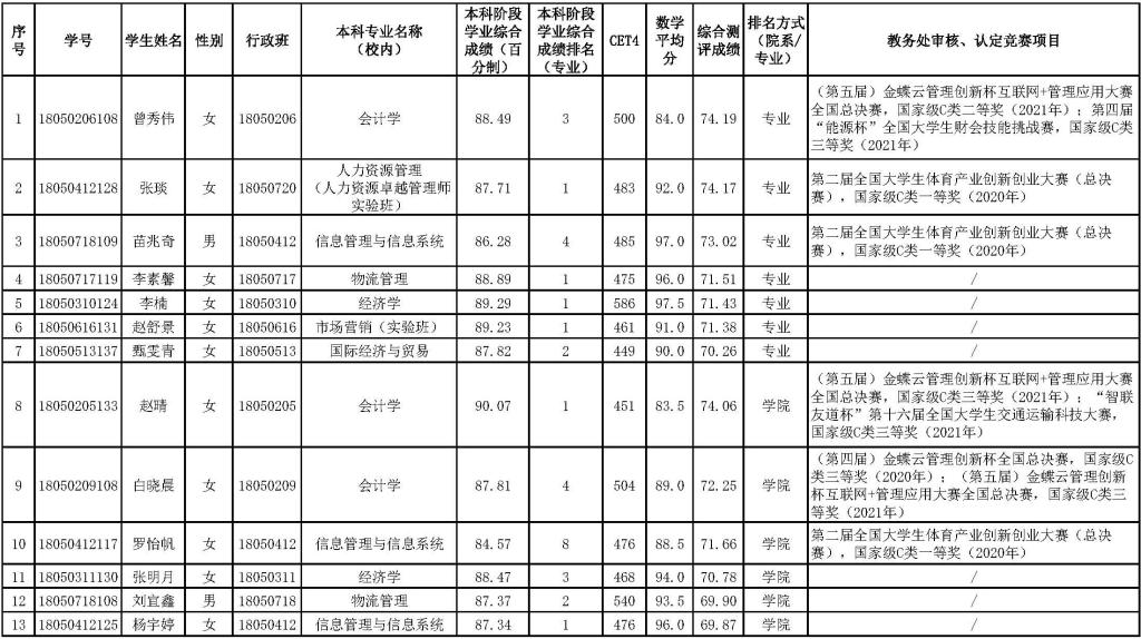 2022年拟推荐优秀应届本科毕业生免试攻读硕士研究生候选人选,现将名单公示如下: