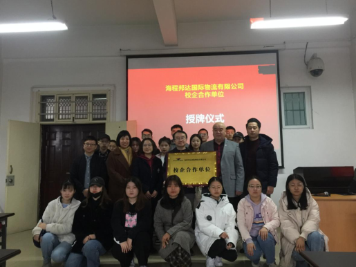 向海燕副院长代表学院做了发言,感谢海程邦达一直以来对国际贸易专业学生的实习、毕业生就业方面的支持,并表示在双方建立校企合作协议之后,将通过开展学生实习和培养、教师实践培训、企业人员进修培训、企业奖学金设立等多方位的互利合作,打造学校、学生、企业之间的多赢局面。经济系康玉泉副主任代表学院接收了授牌。