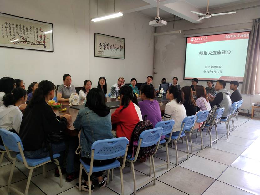 首先,苏兵老师对同学们寄语。英语作为一门技能,是以后职业发展的敲门砖,学好、学精是很有必要的,希望同学们能不断提高自己的英语水平,珍惜大学时光,提升自身综合素质。预祝同学们四六级取得满意的成绩。接下来,进入座谈交流环节。同学们就自己或者班级同学在英语学习过程中遇到的困惑、问题、方法、目标等进行自由提问,老师们一一进行认真的解答和建议。其中,外教老师Terence重点讲到,英语学习是一个不断重复的过程,就像我们学习自己的母语一样,它需要环境去适应与练习。同时,还把自己总结的600个英语单词‘学习秘籍’与大家共享。最后,尚宁华老师对座谈会进行了总结,对同学们提出了殷切的期盼。