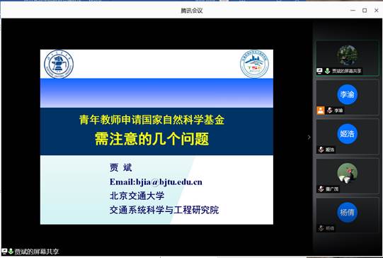 邀请北京交通大学博士生导师贾斌教授,通过腾讯会议举办“青年教师申请国家自然科学基金需要注意的几个问题”的专题讲座。学院党政领导、学术委员会成员、学术骨干及计算机学院部分老师共38人参加。