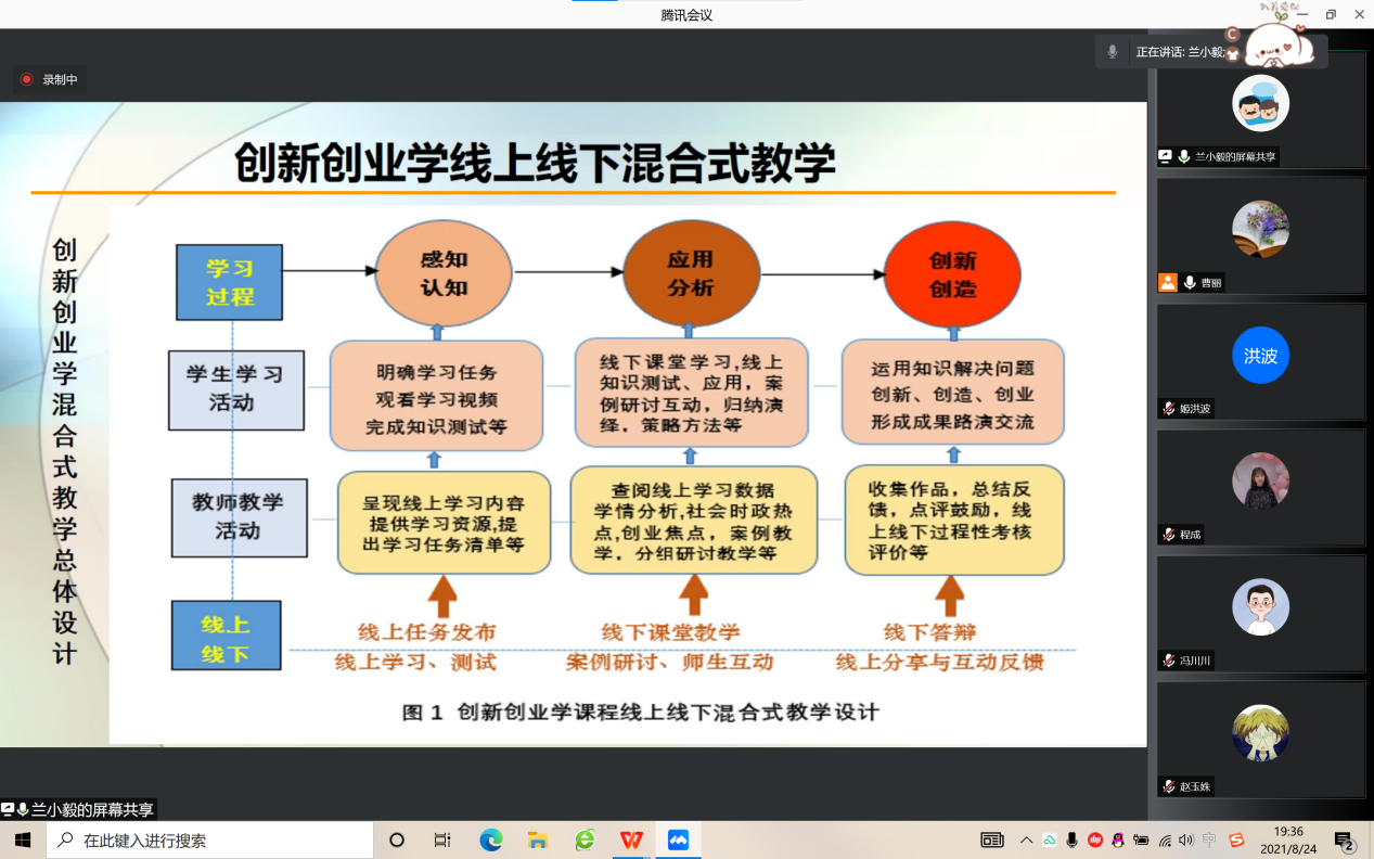 研讨会上,兰小毅副教授结合自身对“混合式教学模式”的探索和时间,以《创新创业学》课程为切入点,分享了自己的混合式教学经验。首先,兰老师认为在线上线下混合式教学中,线上与线下知识点不能重复,应该是相融合的,线上重点在学生对基础知识点的学习,线下重点在于知识点在案例中如何应用,并且强调在进行混合式教学中要依托一定的教学工具(如慕课堂、雨课堂、超星学习通等),通过“平台+工具”的方式使得学生真正对课程知识掌握。其次,兰老师以《创新创业学》第七章创业营销为例,从课前--课中--课后三个阶段中如何备课及如何展开课堂讨论进行了详细的经验分享。在兰老师分享完经验后,课程组老师就备课中遇到的问题与兰老师展开了深入的交流和研讨。