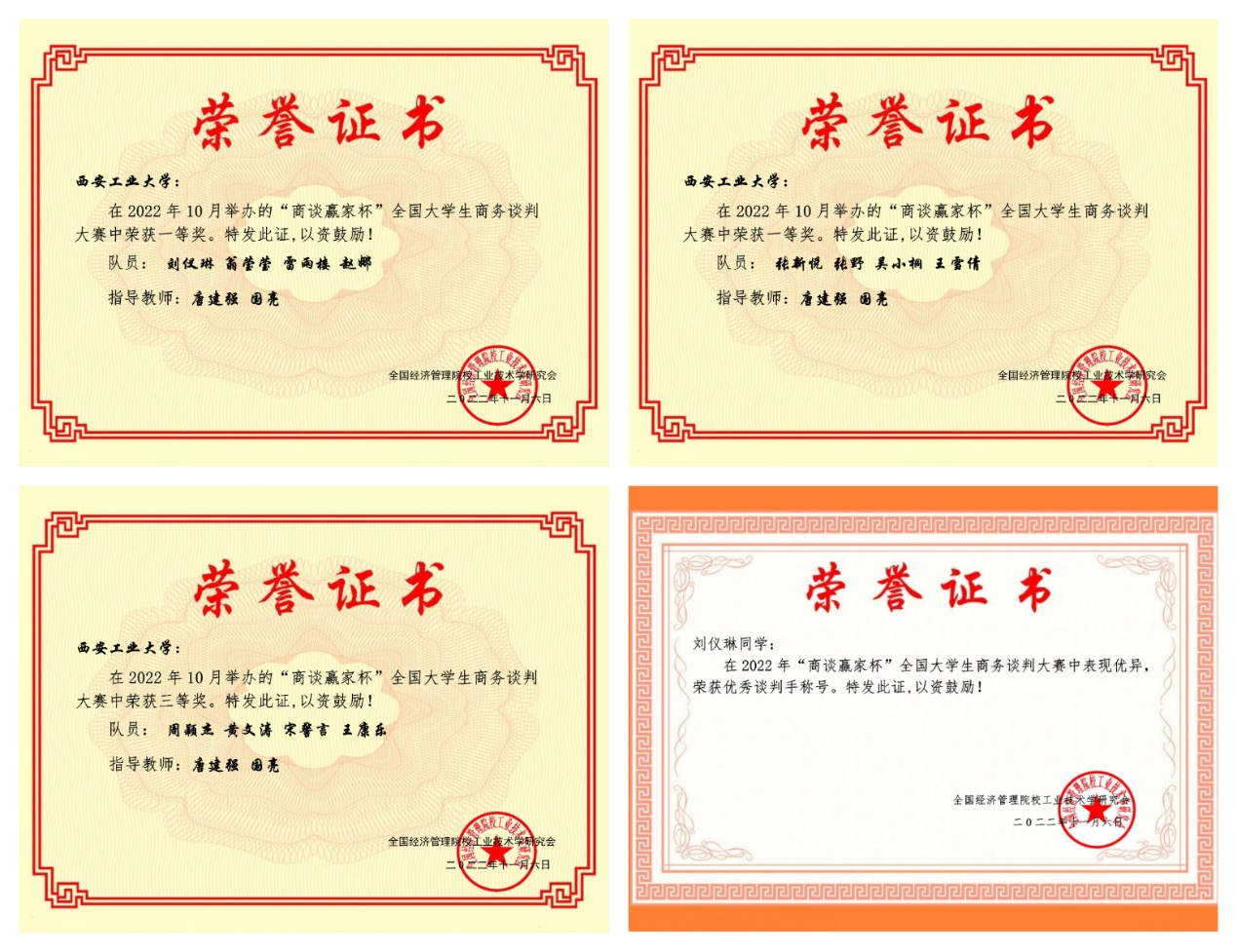 国际经济与贸易专业唐建强、国亮指导下,国贸专业本科生刘仪琳、翁莹莹、雷雨楼、赵娜组成的谈判一队和张新悦、吴小桐、王雪倩、张野组成的谈判二队荣获中文赛道全国一等奖;周颖杰、黄文涛、宋警言、王康乐组成的谈判三队荣获中文赛道全国三等奖;刘仪琳同学荣获“最佳谈判手”称号。