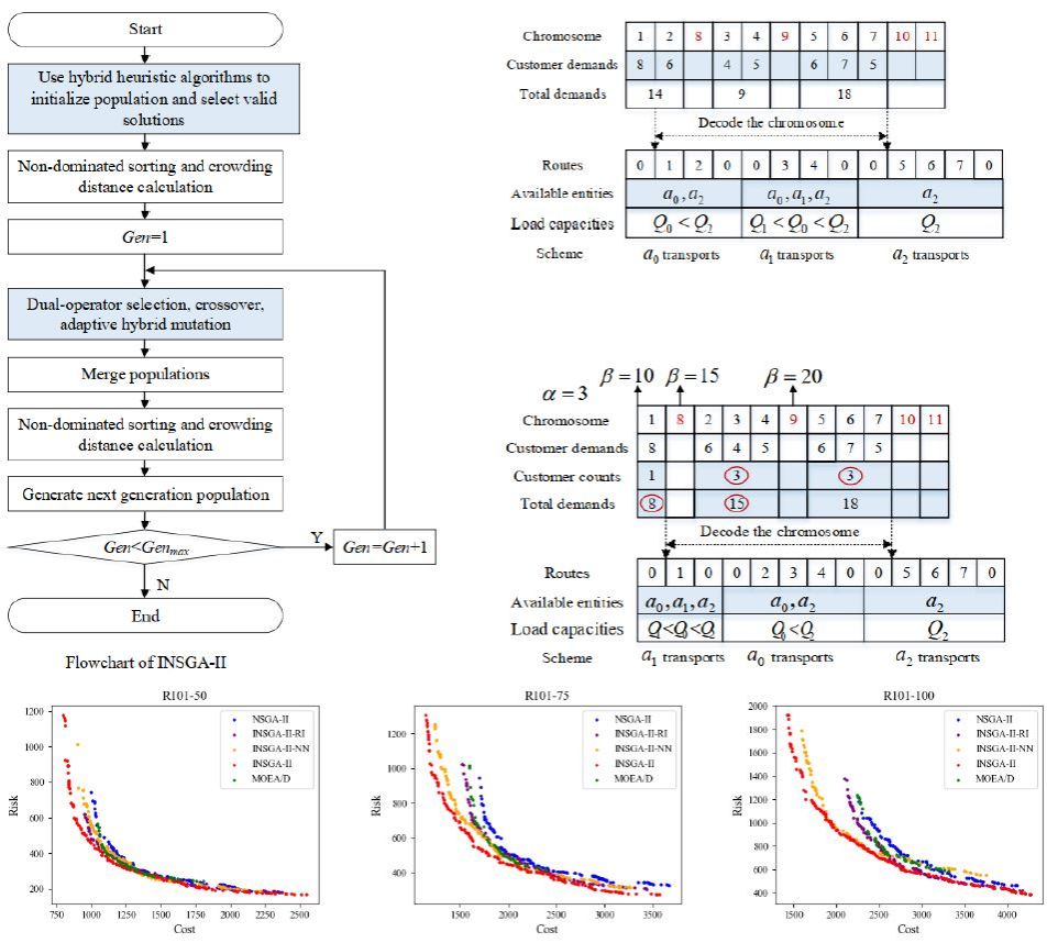 本研究针对危险品物流行业企业间协同不足、资源利用率低的卡脖子痛点,基于共享物流整合资源提高效率的思想,首次将企业间的运力共享引入危险品运输问题。研究构建了基于运力共享的危险品运输路径优化模型,模型中创新性地融入了运力共享决策以及使用外部车辆进行运输所带来的风险增幅。针对该复杂优化模型的特征,设计了改进的非支配排序遗传算法(INSGA-II),在初始解生成、解的有效性检验、选择机制以及变异算子等方面进行了全面改进。通过计算实验测试INSGA-II算法的性能,结果表明INSGA-II算法可以在帕累托解集的超体积方面带来10.62%的提升。进一步通过车辆数量、装载能力及风险增幅等关键要素的敏感性分析,揭示了运力共享下影响危险品运输成本与风险的关键规律,为企业优化基于运力共享的危险品运输方案提供了重要决策支持。
