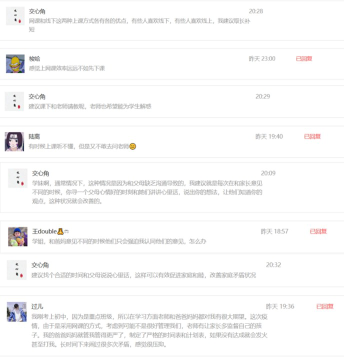在实践过程中,实践队公众号“交心角”不断地收到来自不同城市中小学生的留言,如“自身自制力不足总在上网课时分心、与家长产生矛盾不知如何解决”,倾诉方面众多,实践队也通过这些留言了解到中小学生网课期间的问题和真实感受。实践队根据了解到的有关心理辅导的相关知识,结合自己的亲身经历和以往积累的经验,对留言的中小学生进行心理辅导,帮助他们克服在网课期间学习生活方面的心理问题,改善和家长之间的矛盾。