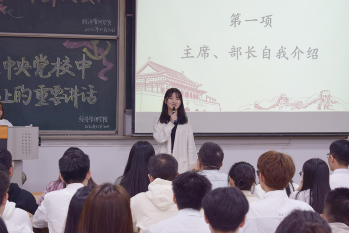 在教1-303举办2020—2021学年第一学期团学组织干部大会。出席本次大会的嘉宾有团委书记许金鑫。会议由张梦驰同学主持。