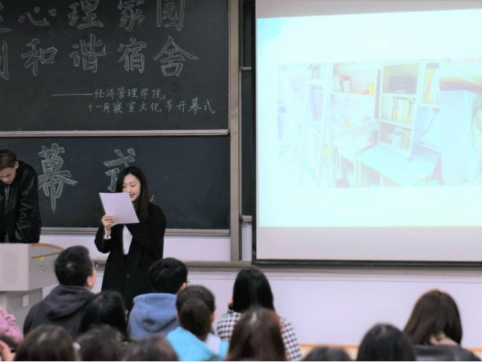 开幕式伊始,王传宇对学院各学科宿舍评比活动进行了详细介绍,并对优秀寝室进行照片展示。紧接着,优秀寝室长代表梁艳娇上台发言,她讲到维持一个良好的宿舍环境和优秀的学习氛围,离不开每一位同学共同的努力,有一份耕耘才有一份收获。随后,寝室优秀个人代表霍子怡表示团结友爱的宿舍氛围是靠用心付出来培育的,积极向上的宿舍文化是靠美德和智慧去营造的。最后,许金鑫对本次寝室文化节开幕式进行了总结。
