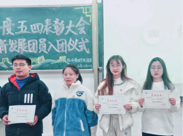 在教1-104召开2019-2020年度五四表彰大会暨新发展团员入团仪式,出席本次的嘉宾有团委书记许金鑫。会议由组织部温迪主持。