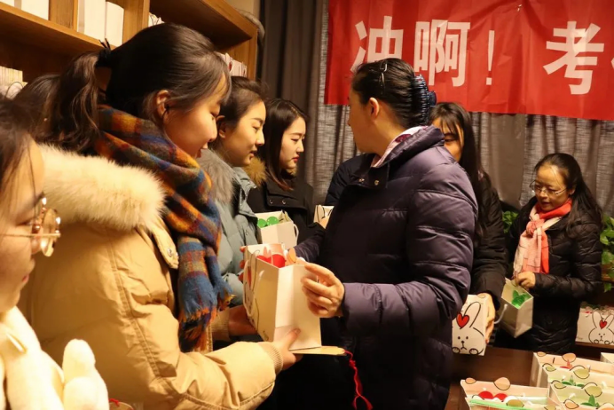 党委书记、院长苏兵、党委副书记程新峰、副院长姬浩、副院长向海燕及学生工作干部来到了学生公寓为备考学生加油打气,并送上精心准备的考研爱心包。爱心包虽小,但内容丰富,有学院精心准备的文具、糖果和水果。学院辅导员侯剑波说,苹果寓意“苹”步青云,橙子寓意马到“橙”功,这是对考研学子最暖心的祝福。