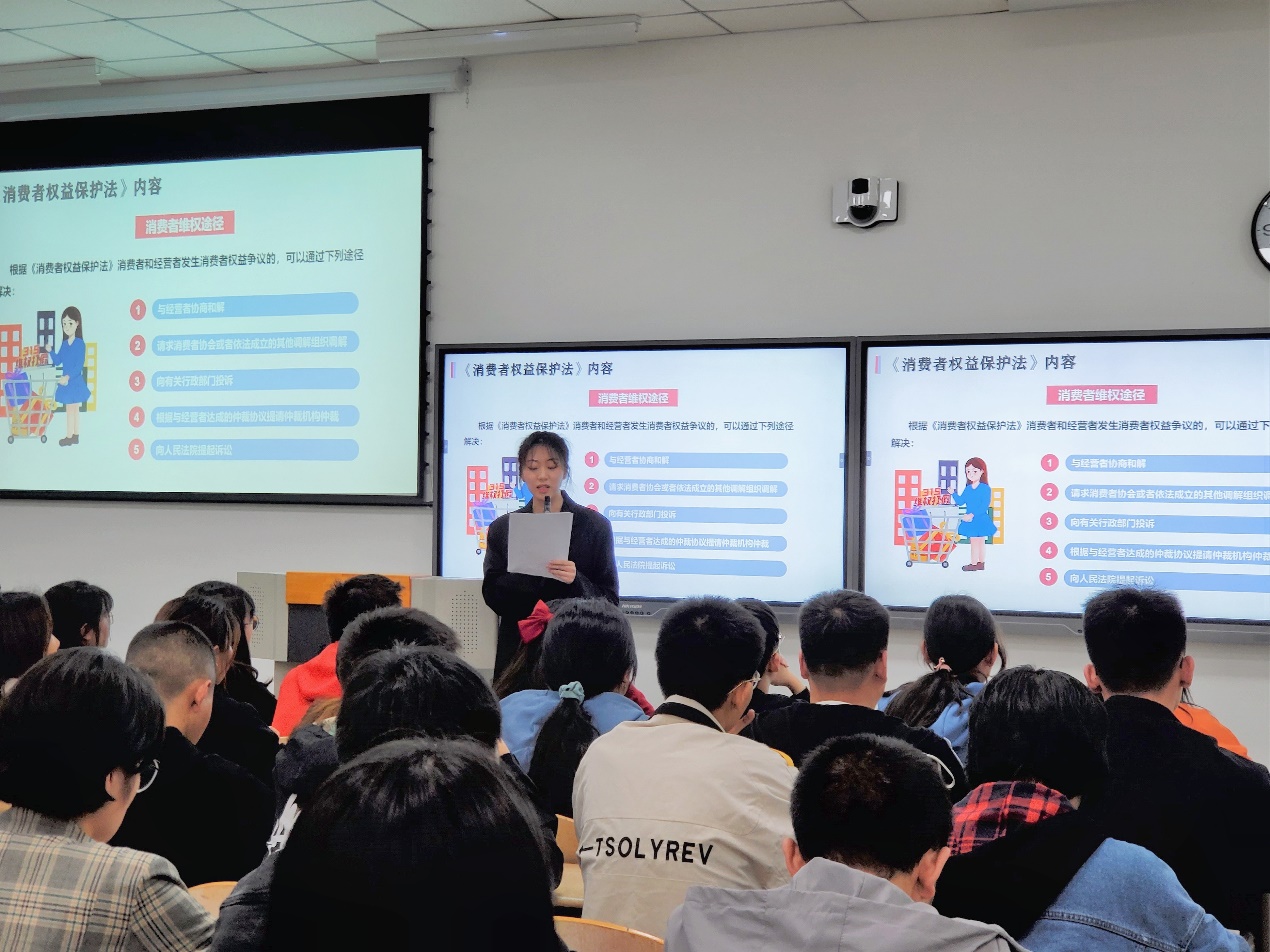 团委开展了以“明法于心,消费放心”为主题的《消费者权益保护法》知识竞赛,让消费者权益普法进校园,助推校园法治建设。本次活动由尹若冰主持。