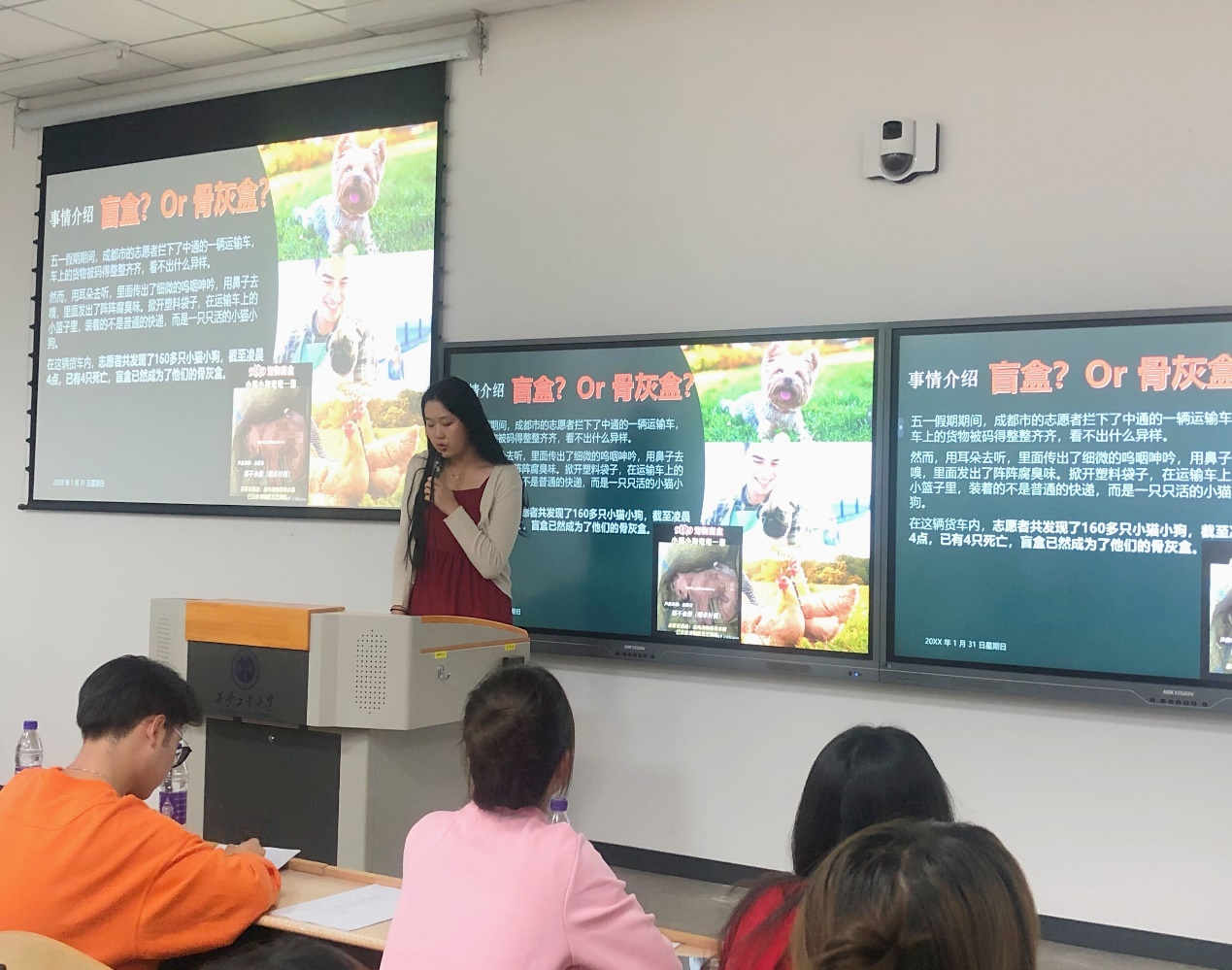 本次大赛评委由许金鑫、温迪、吴庆圆、田爽、徐海鹏、张佳倩六人组成。比赛过程中,来自二号选手李欣悦的《宠物盲盒》,以对“盲盒”一词的定义点明主旨,呼吁人们尊重生命、珍爱生命,引发了观众们的深刻思考。