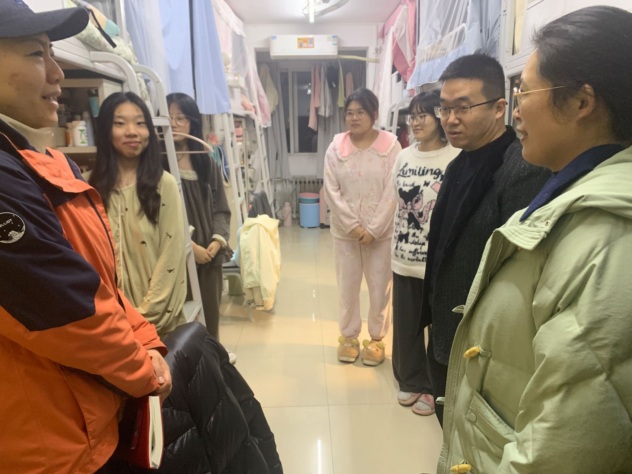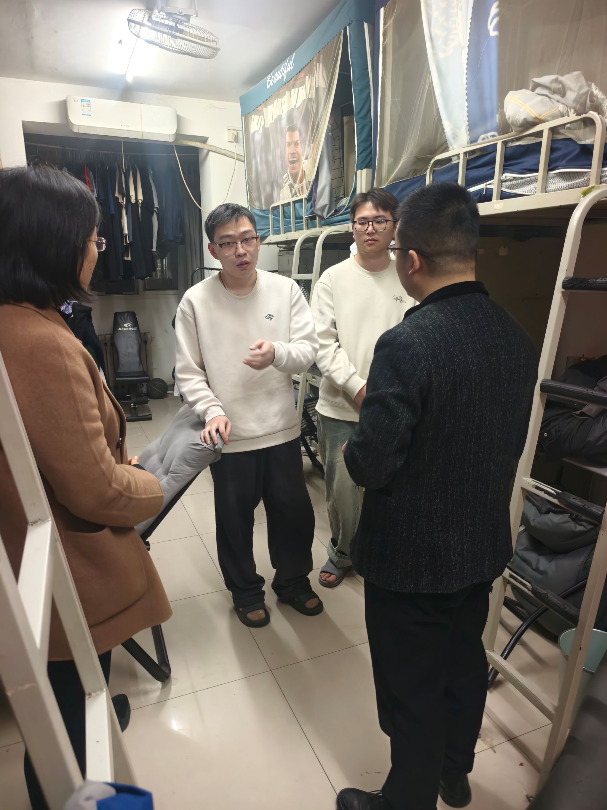 走访过程中,张旭对学生宿舍的卫生状况、财产安全、用电安全及消防隐患进行了细致排查。针对部分宿舍存在的物品摆放杂乱、插座使用不规范等问题,现场提出整改意见,叮嘱同学们严格遵守校规校纪,杜绝违规电器,做好个人财产安全防护,切实增强安全防范意识。