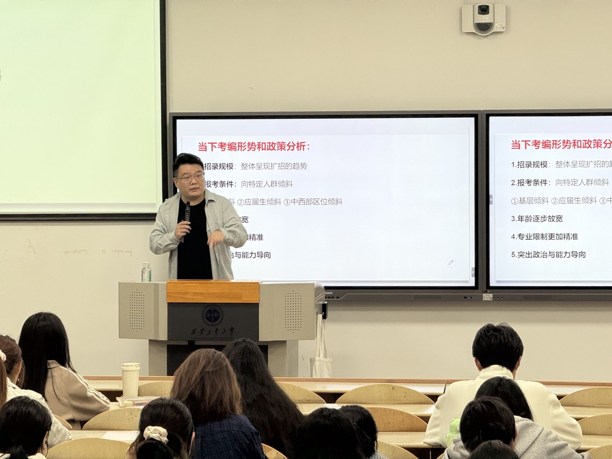 讲座中,杨老师围绕大学生就业形势、国考省考及事业单位考试差异、公职岗位薪资待遇、高效备考建议四大核心板块展开分享。他先从当下大学生就业形势切入,对比民营企业、国企、公职岗位等不同就业方向的优劣势,结合近年高校毕业生人数数据,点明公职类考试的扩招趋势与政策倾斜方向。随后,杨老师详细梳理了国考、省考、事业单位及选调生考试的招录对象、岗位特点、报考条件与竞争比,以陕西省招录情况为例,通过具体岗位招录数据、进面平均分、题型题量分布等实例,拆解行测、申论的备考重点与答题技巧,为学子们提供了切实的备考指导。