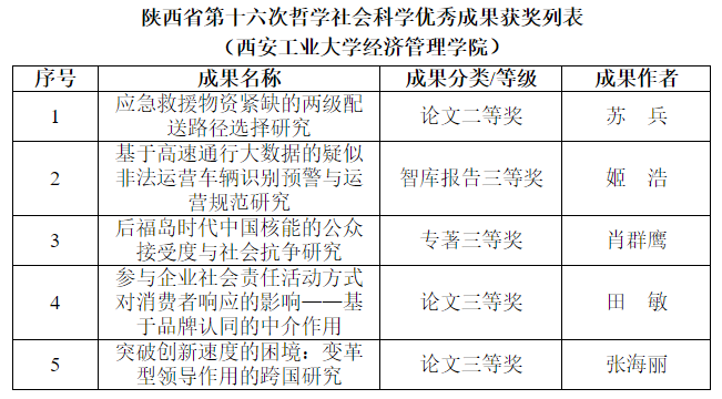 共5项成果获奖,其中二等奖1项,三等奖4项。分别为苏兵团队的《应急救援物资紧缺的两级配送路径选择研究》(论文二等奖);姬浩团队的《基于高速通行大数据的疑似非法运营车辆识别预警与运营规范研究》(智库报告三等奖);肖群鹰团队的《后福岛时代中国核能的公众接受度与社会抗争研究》(专著三等奖);田敏团队的《参与企业社会责任活动方式对消费者响应的影响——基于品牌认同的中介作用》(论文三等奖),张海丽团队的《突破创新速度的困境:变革型领导作用的跨国研究》(论文三等奖)。